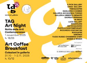Per il quarto anno consecutivo, TAG propone la sua iniziativa mattutina dedicata al pubblico dell’arte contemporanea: le TAG – Art Coffee Breakfast. I visitatori potranno recarsi nelle gallerie associate Venerdì 31 ottobre e sabato 1 e domenica 2 novembre 2025 | ore 10 – 12 e partecipare alle “colazioni con l’arte”, un momento conviviale per incontrare artisti, galleristi e curatori.